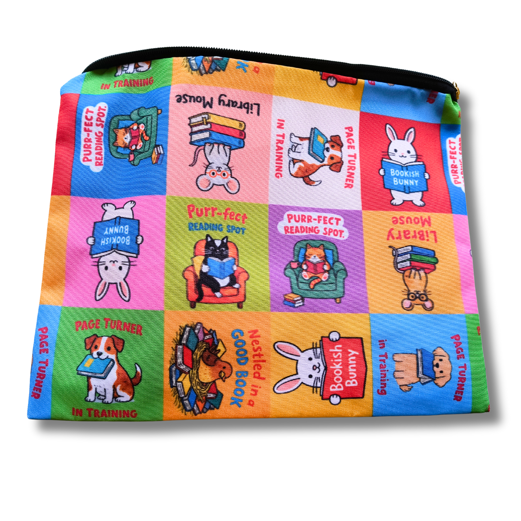 Calling all bookworms! This delightful zip-up pouch is the perfect accessory for anyone who loves books and cute animals in equal measure.