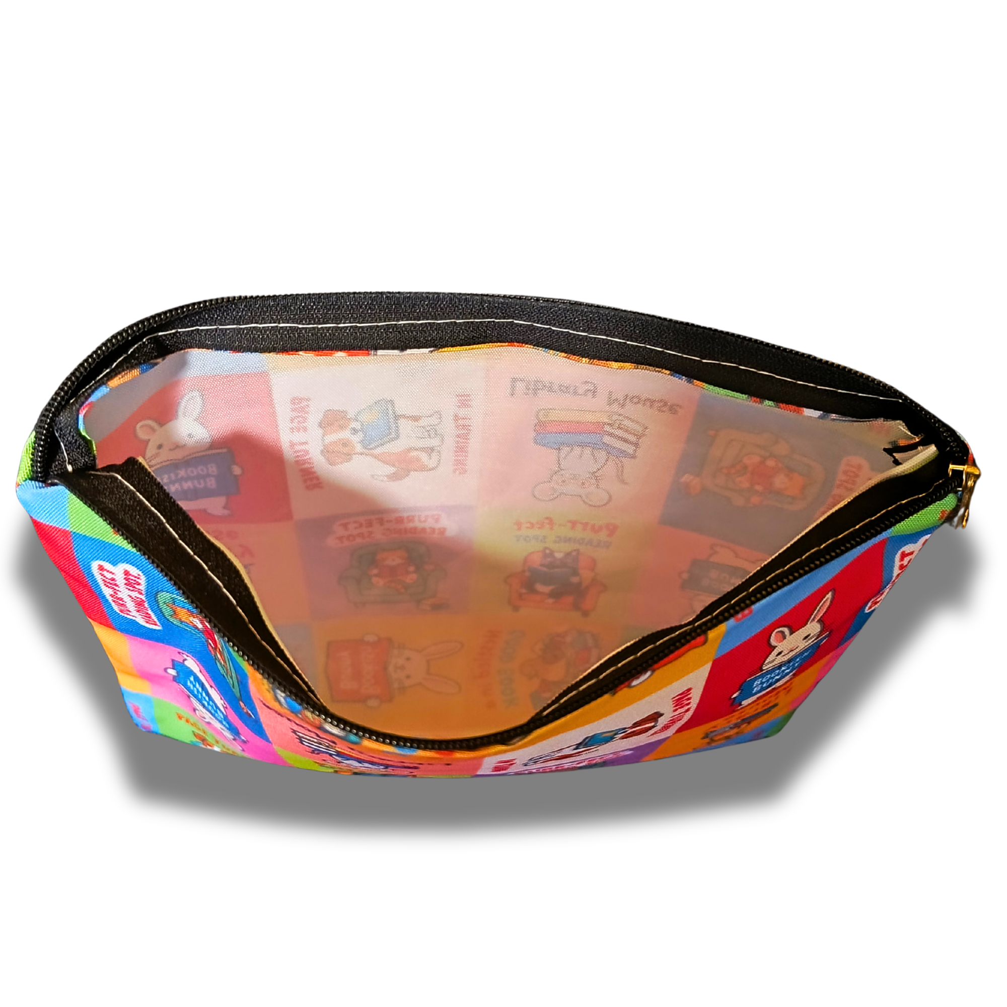 A fun and vibrant zip-up pouch perfect for book lovers! Featuring adorable reading animals including the Bookish Bunny, Library Mouse, Page Turner pup and Purr-fect Reading Spot cat, all set against a bright, colourful grid design. Made from polyester with a semi-transparent mesh lining. Measures 22cm x 17cm – ideal as a pencil case, makeup bag, or everyday essentials pouch.