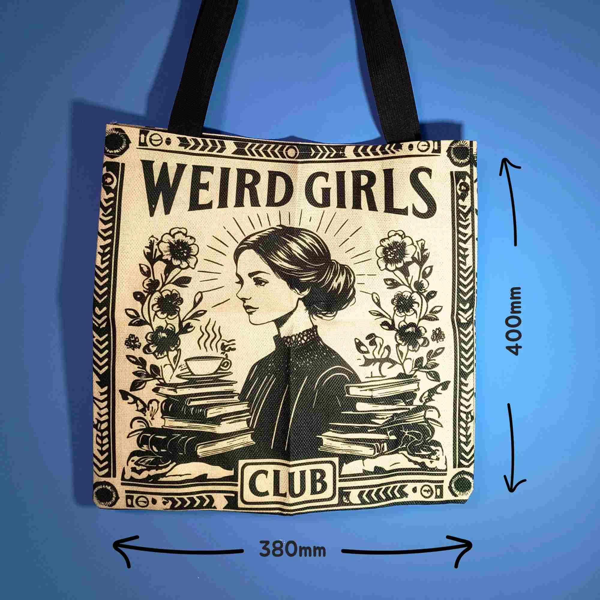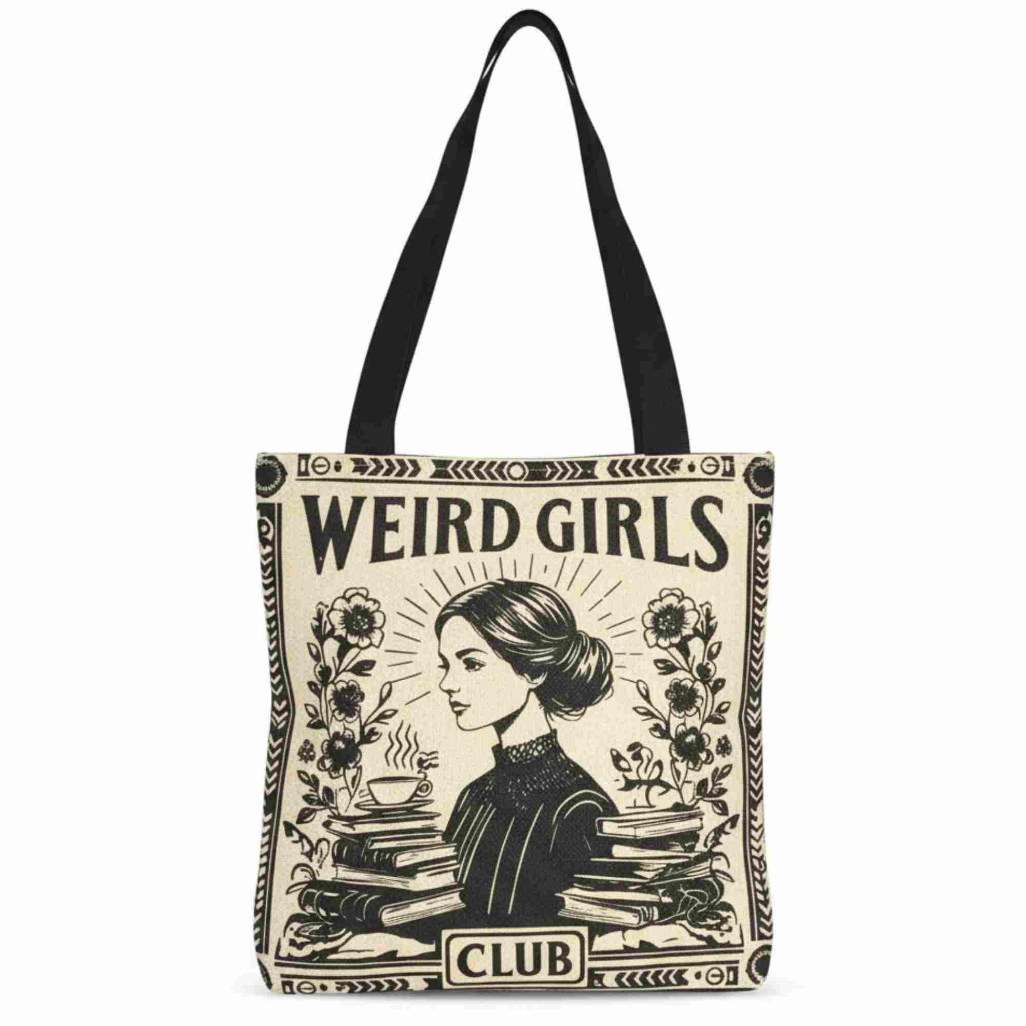 This Weird Girls Club tote bag celebrates bookish minds and beautifully odd souls. Featuring a striking vintage-inspired illustration surrounded by books and florals, itβs a statement piece for anyone who feels most at home among stories.